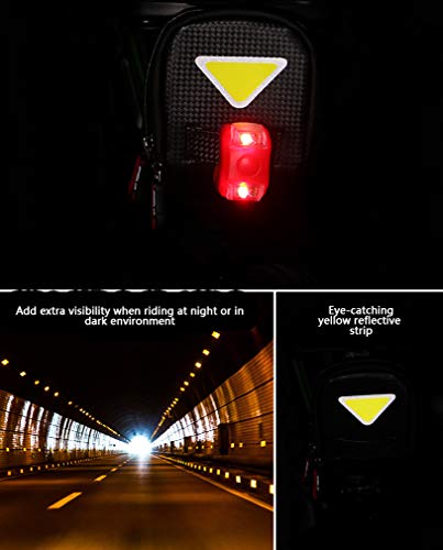 Details: Features Fit & Secure in Place Strap-On mounting design allowing the saddle bag to be secured in place on most bicycle seats and seat posts. High quality reflective material and Velcro strap loop to upgrade your riding safety. Room for All the Essentials. A perfect place for your cell phone, wallet, tire tools, mini pump, bike lock, and etc. Easy to Access Big zippered opening mouth design for riders' convenience. Taillight Compatible With taillight hanger on the back, cyclists can easily attach the taillight on the saddle bag, ensuring night time riding safety. Specification Color: Black Size: 7” x 3.5” x 4” Weight: about 4oz (120g) Package Included: - 1x Bicycle Saddle Bag/ Bicycle Bike Bag /Under Seat Packs Seat Bag